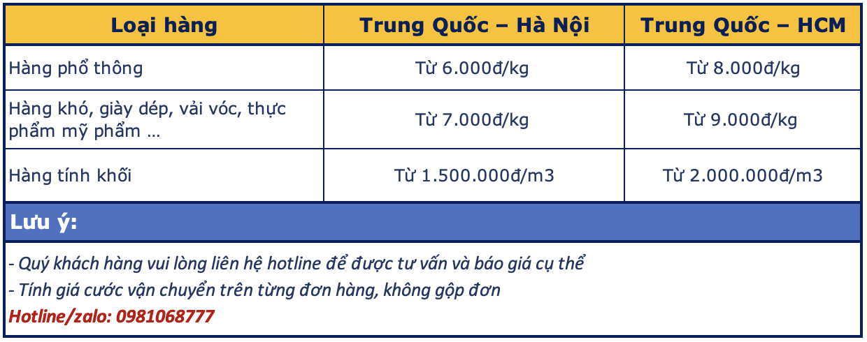 Chi tiết bảng phí vận chuyển Trung - Việt