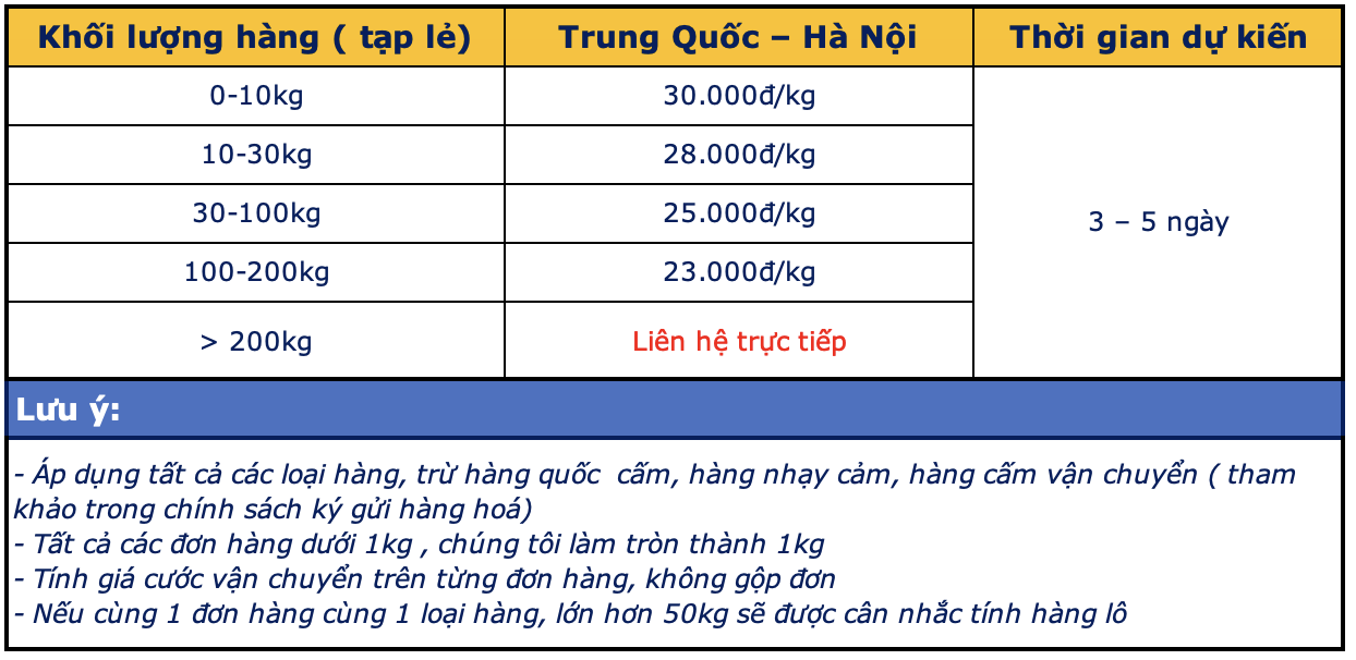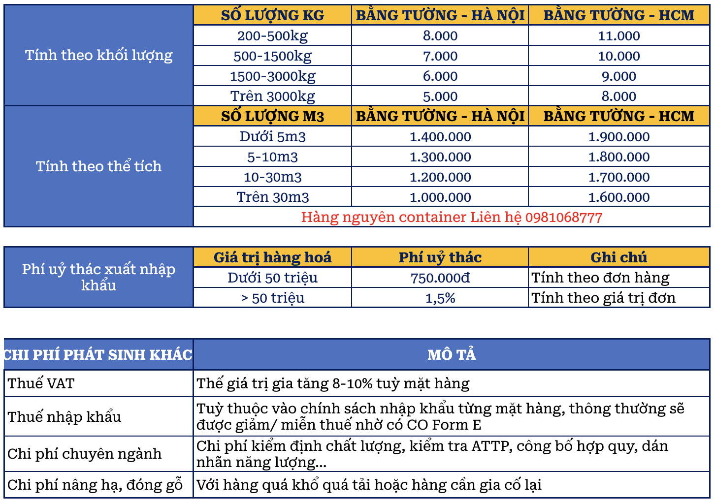 Bảng phí vận chuyển Chính ngạch Trung Quốc - Việt Nam