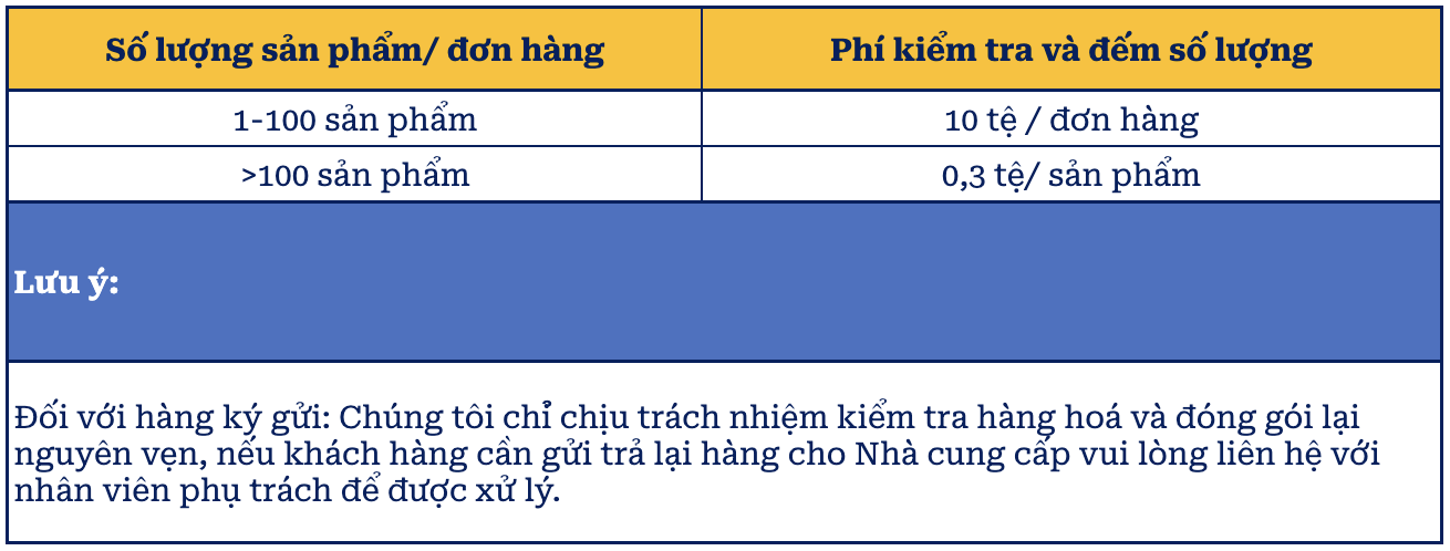 Để kiểm tra hàng hoá khi về kho Trung Quốc, Quý khách hàng có thể sử dụng thêm dịch vụ kiểm đếm hàng hoá, bảng phí như sau:
